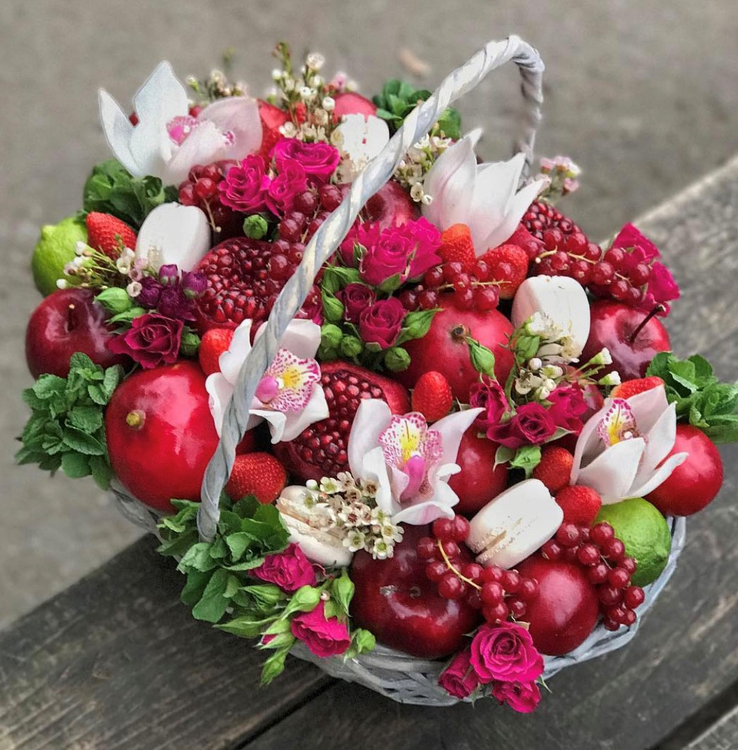 Состав: корзина большая, манго, лайм, гранаты, яблоки. сливы, клубника, печенье макаронс, кустовая роза, орхидеи, хамелациум. 7 кг.