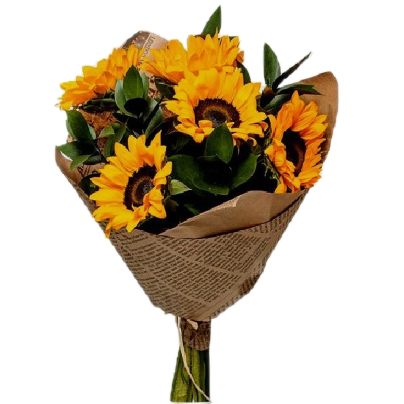 Букет состоит из 5 подсолнухов, зелень, крафт, атласная лента.
