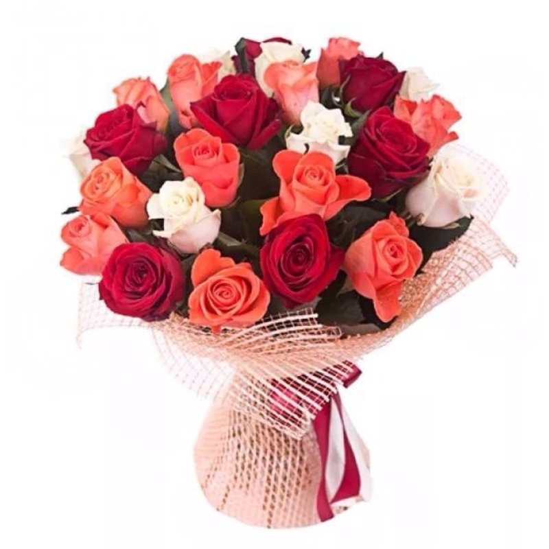 Букет состоит из MIX из 25 роз, сетка, атласная лента.