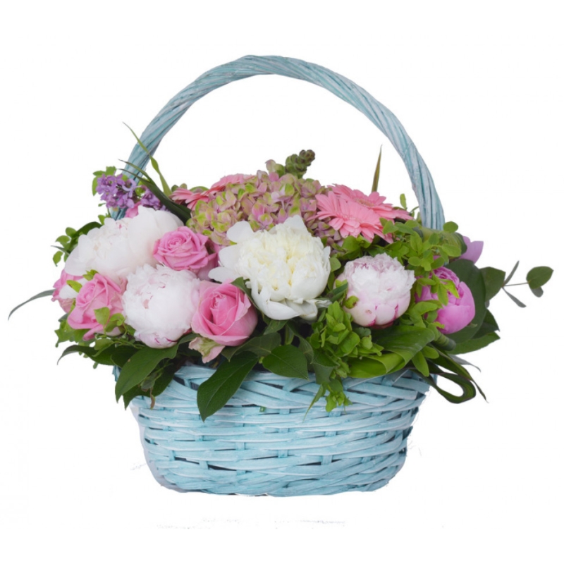 Букет состоит из 9 пионов, 7 роз, 1 ветка кустовой розы, 3 гербера, 1 гортензия, 2 гиацинта, зелень, корзина, оазис.