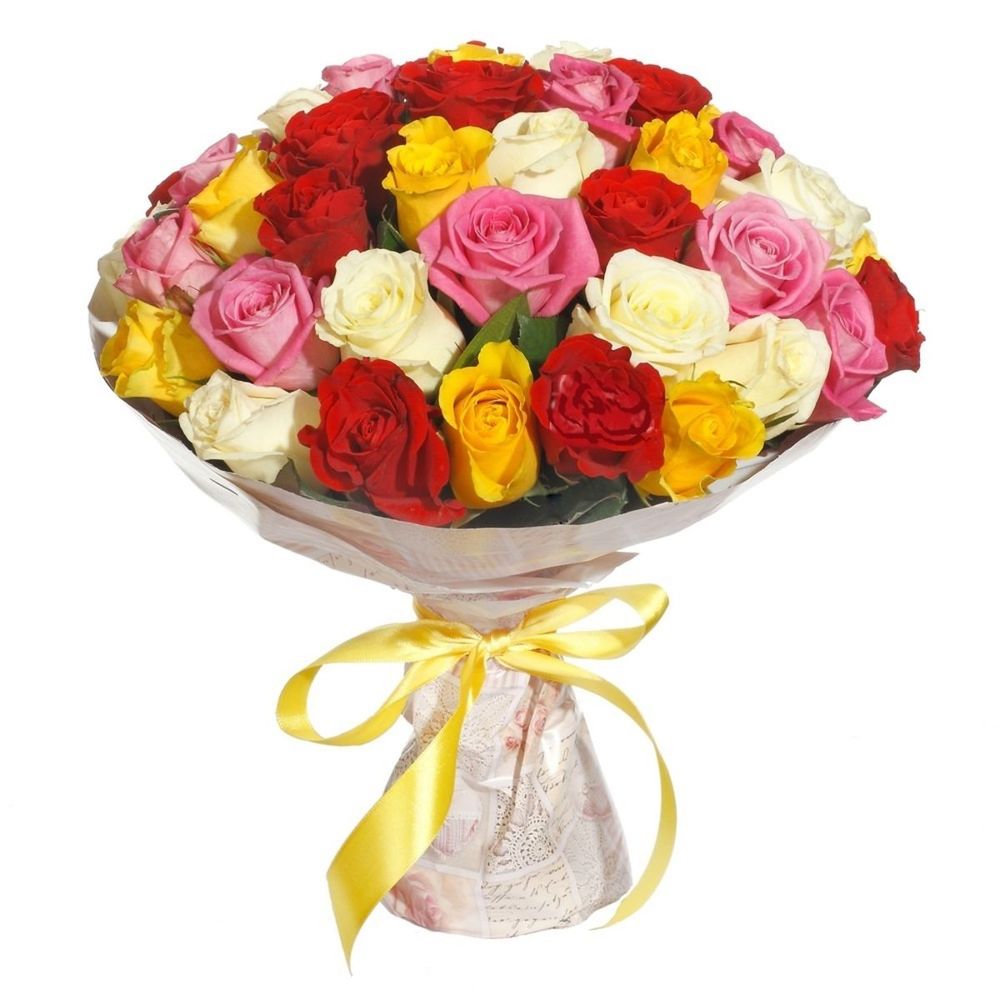 Букет состоит из 9 желтых роз, 9 красных роз, 9 розовых роз, 8 белых роз, красивая упаковка.