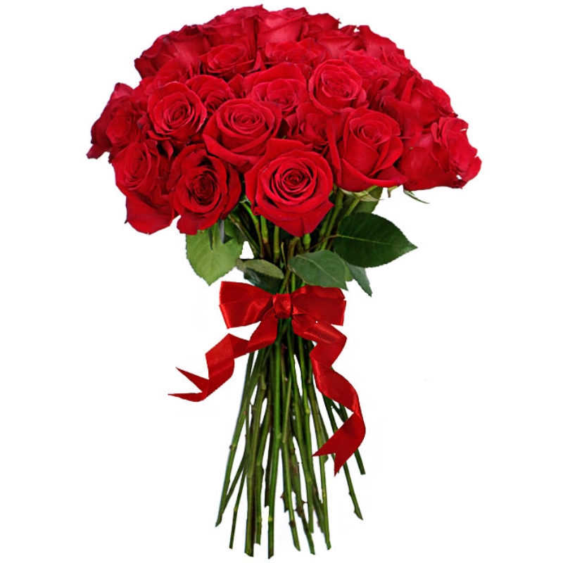Букет состоит из 27 красных роз, прозрачная упаковка, красная лента.